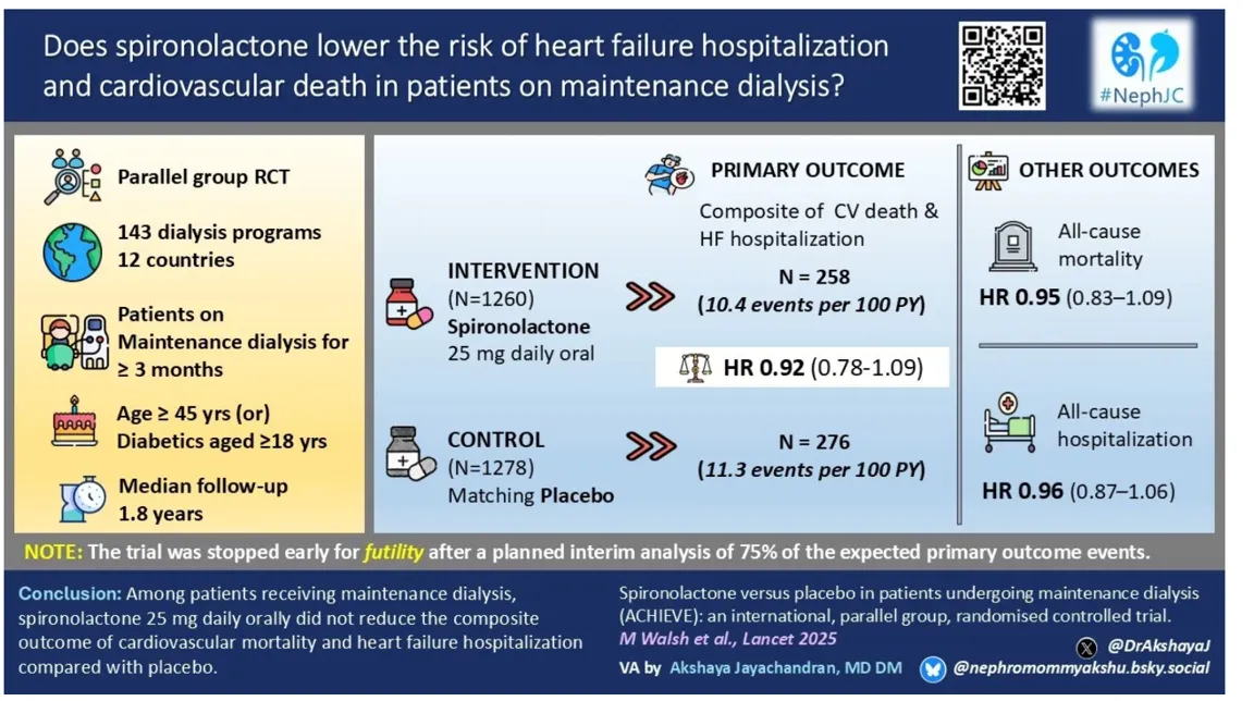 O ACHIEVE trial foi pensado para testar uma hipótese fisiopatológica forte: o bloqueio do receptor mineralocorticoide poderia reduzir eventos cardiovasculares em pacientes em hemodiálise, uma população caracterizada por hipertrofia ventricular esquerda, fibrose miocárdica e alto risco de arritimia maligna. A espironolactona, eficaz na insuficiência cardíaca e na DRC não dialítica, parecia uma candidata natural para preencher essa lacuna terapêutica.