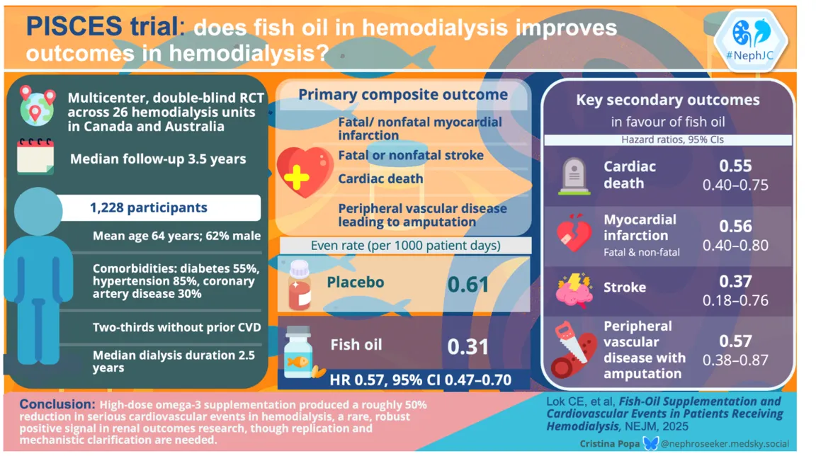 O PISCES, publicado no New England Journal of Medicine, representa uma exceção importante no cenário historicamente negativo dos trials cardiovasculares em diálise. Nesse trial randomizado multicêntrico, duplo-cego, com mais de 1200 pacientes em hemodiálise, a suplementação com n-3 polyunsaturated fatty acids (óleo de peixe) resultou em redução significativa de eventos cardiovasculares graves em comparação ao placebo.