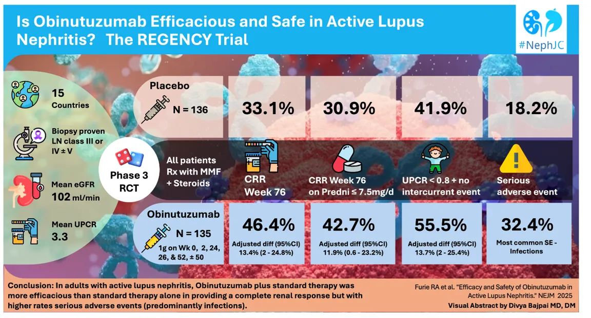 O REGENCY é um excelente exemplo da nova geração de ensaios clínicos nas glomerulopatias inflamatórias, desenhados para responder perguntas clínicas de forma mais rápida e pragmática. O estudo avaliou o obinutuzumabe, um anticorpo anti-CD20 de segunda geração, mais potente na depleção de células B do que o rituximabe, em pacientes com nefrite lúpica ativa. Em vez de esperar exclusivamente por desfechos tardios como progressão para ESKD, o trial priorizou desfechos substitutos clinicamente relevantes, como redução sustentada da proteinúria e preservação da função renal.