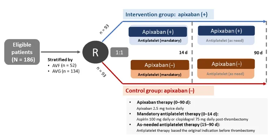 A trombose de acessos vasculares é uma complicação frequente em pacientes em hemodiálise, levando a altas taxas de morbidade, interrupções no tratamento e aumento dos custos. Este ensaio clínico randomizado multicêntrico, publicado no Kidney International ([link](https://www.kidney-international.org/article/S0085-2538(24)00792-0/abstract)), avaliou a eficácia e a segurança do apixaban, um anticoagulante oral direto, na prevenção de trombose recorrente após trombectomia de acesso vascular.