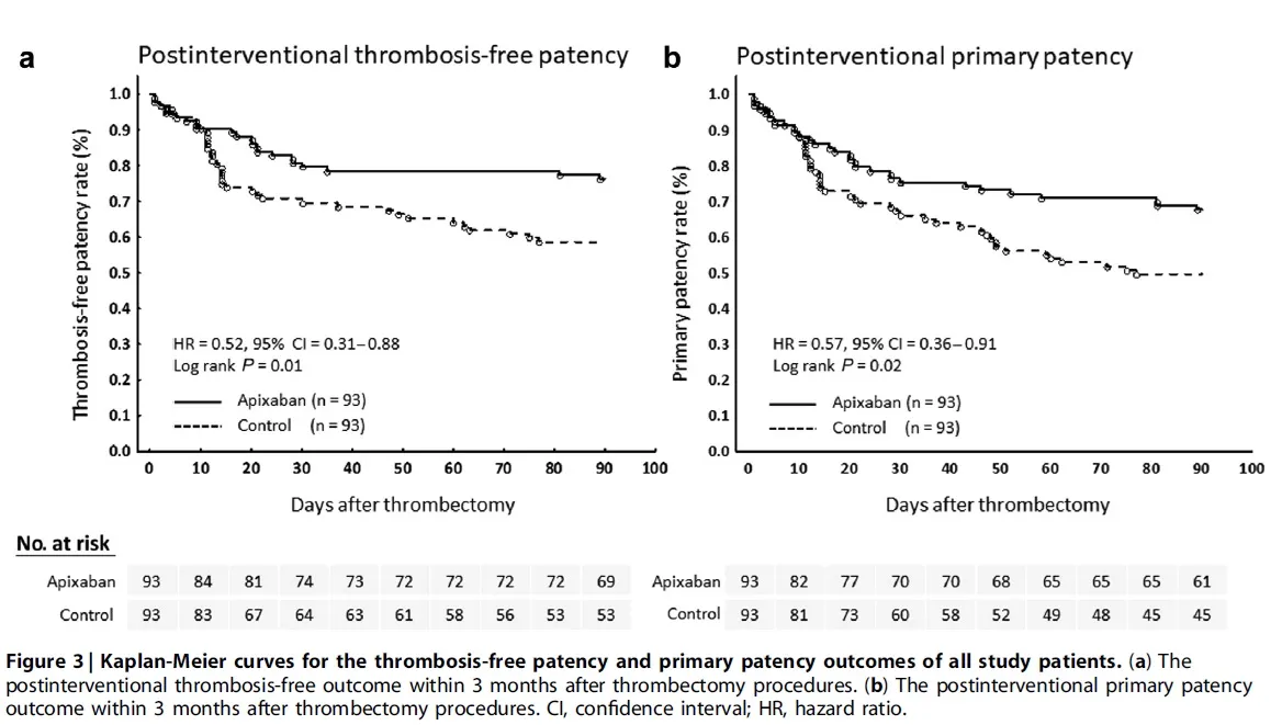 Os resultados mostraram que o apixaban reduziu significativamente a ocorrência de trombose em três meses (24,0% no grupo apixaban versus 40,8% no grupo controle; HR: 0,52; IC 95%: 0,31–0,88). A falha de patência primária também foi menor no grupo tratado (32,2% vs. 49,5%; HR: 0,57; IC 95%: 0,36–0,91). Em seis meses, os benefícios persistiram, com taxas de trombose de 37,6% no grupo apixaban contra 50,5% no grupo controle. Embora a incidência de sangramentos menores tenha sido maior no grupo apixaban (22,6% vs. 7,5%), não houve aumento significativo em eventos de sangramento maior ou mortalidade.