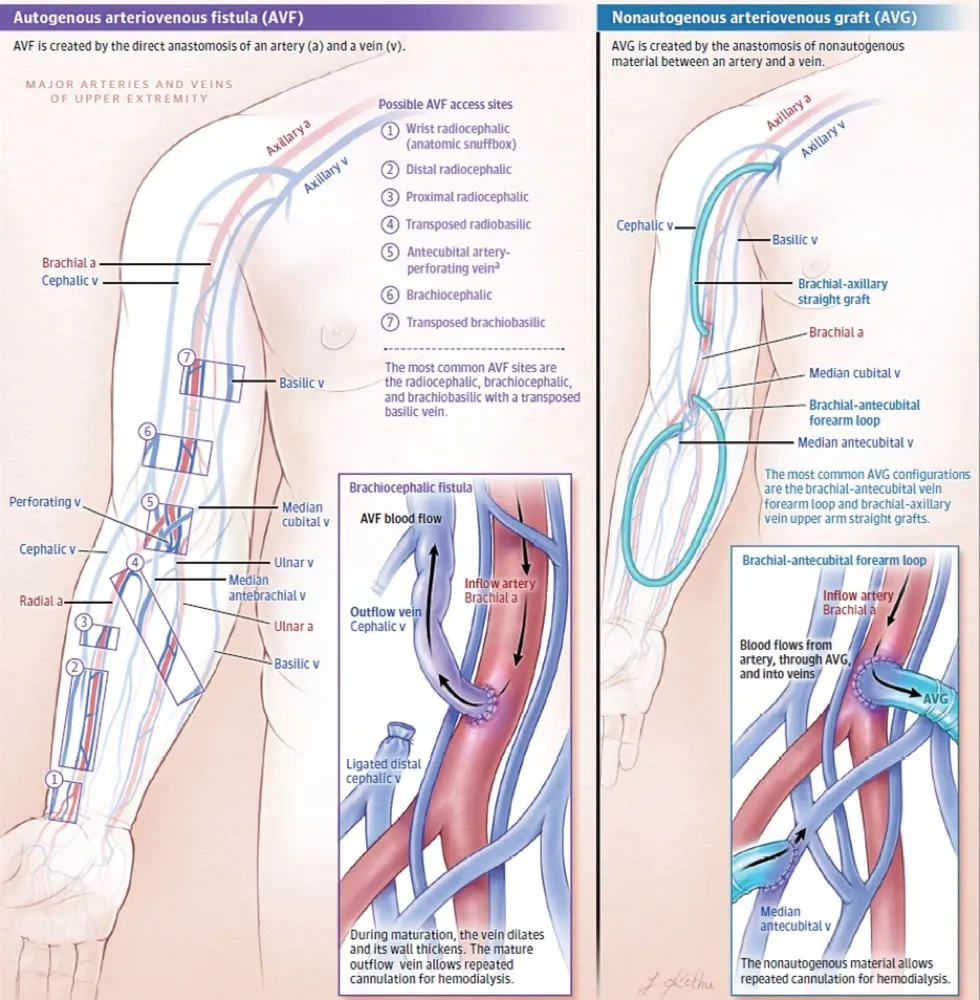 Os acessos arteriovenosos para hemodiálise são fáceis de canular, promovem um fluxo de sangue eficiente para a terapia, possuem uma excelente taxa de patência a longo prazo associado com mínimas taxas de complicações, é