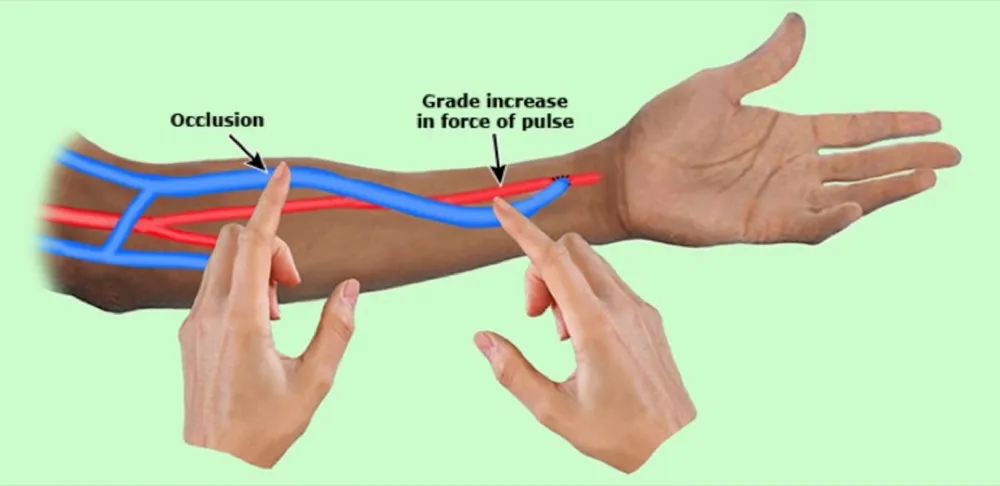 A presença de uma FAV grande e distendida ou de um enxerto AV com aumento de pulso muito forte sugere fluxo sanguíneo elevado e deve levar a uma avaliação para determinar o efeito do acesso na hemodinâmica sistêmica. Quando a FAV é ocluída transitoriamente (30 segundos), o grau de aumento (aumento) do pulso