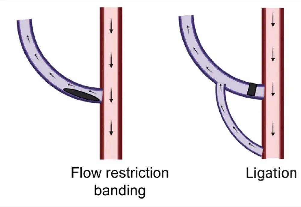 1) Intervenção cirúrgica ou procedimento de bandagem para reduzir o fluxo da fístula?