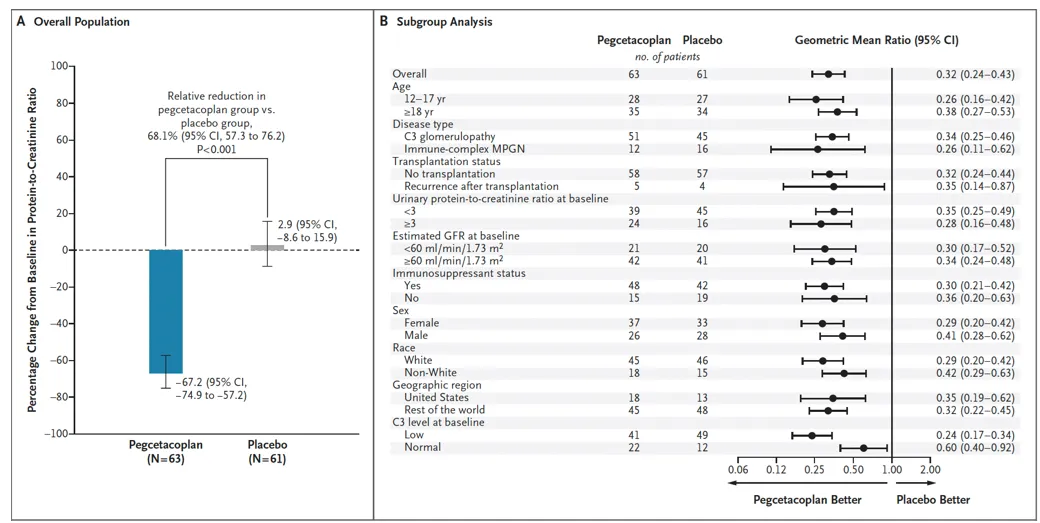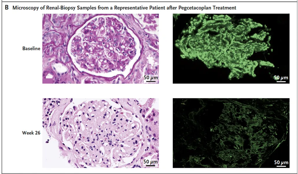 **Referência**: Fakhouri F, Bomback AS, Ariceta G, et al. Trial of Pegcetacoplan in C3 Glomerulopathy and Immune-Complex MPGN. NEJM, 2025 [**[link](https://www.nejm.org/doi/full/10.1056/NEJMoa2501510?query=featured_nephrology)**]