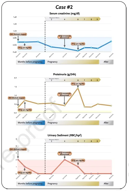 Paciente de 33 anos, inicialmente com proteinúria nefrótica, previamente controlada sem imunossupressão. Após suspensão de anti-hipertensivos antiproteinúricos para engravidar, teve piora da proteinúria. HCQ foi iniciada como medida preventiva. Após interrupção equivocada da HCQ durante a gestação, observou-se piora da proteinúria, com nova melhora após reintrodução. Evoluiu com parto a termo e boa tolerância ao medicamento.