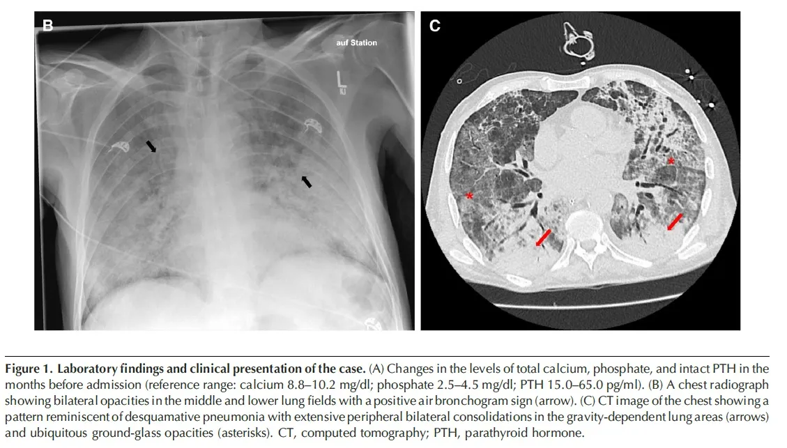 Quatro semanas antes da admissão, ele teve uma infecção por COVID-19 que se resolveu em casa, seguida por sintomas como perda de apetite, saciedade precoce e dor epigástrica. A suspeita inicial era de hiperparatireoidismo terciário, e o tratamento com cinacalcete foi iniciado. No entanto, duas semanas antes da admissão o paciente piorou, desenvolveu febre intermitente e a hipercalcemia piorou, resultando em deterioração rápida do estado clínico.