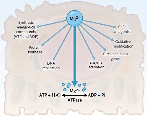 O magnésio é um íon presente em todas as células do nosso organismo e é essencial para diversas funções celulares, como detalhado na imagem abaixo: