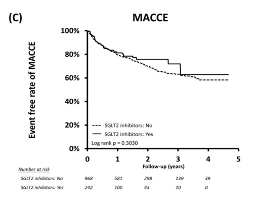 Eventos cardiovasculares (MACCE): Nenhuma diferença significativa entre os grupos (HR 0,98; IC95% 0,69–1,38).