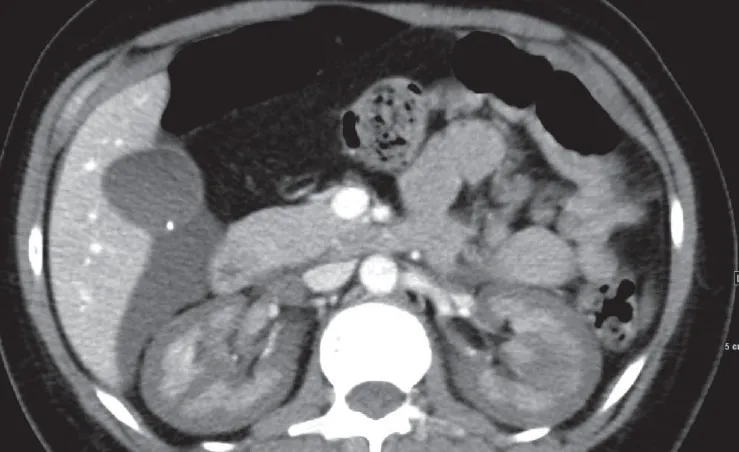 A NCR é uma forma grave e frequentemente irreversível de lesão renal isquêmica, resultante de uma redução prolongada da perfusão arterial renal. Esta condição é geralmente associada à CIVD e apresenta-se com início abrupto de oligúria ou anúria, algumas vezes acompanhada de hematúria macroscópica e dor no flanco. A TC com contraste mostrou a preservação da medula renal e a hipocaptação cortical (rim reverso), confirmando o diagnóstico de NCR.
