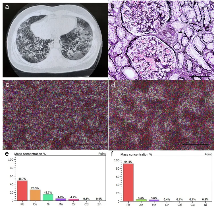 **Figura 1:** Imagem de tomografia computadorizada de pneumonia intersticial aguda (A), coloração com PAS de uma amostra de biópsia renal (B) e imagem obtida por microscopia eletrônica de varredura em baixo vácuo com espectrometria de energia dispersiva de raios X (C), mostrando um gráfico da concentração em massa (%) de cada elemento em um paciente exposto a fumos metálicos (e). Uma amostra de biópsia renal com glomerulonefrite membranoproliferativa foi usada como controle (d, f). A ponta da seta indica a arteríola aferente.