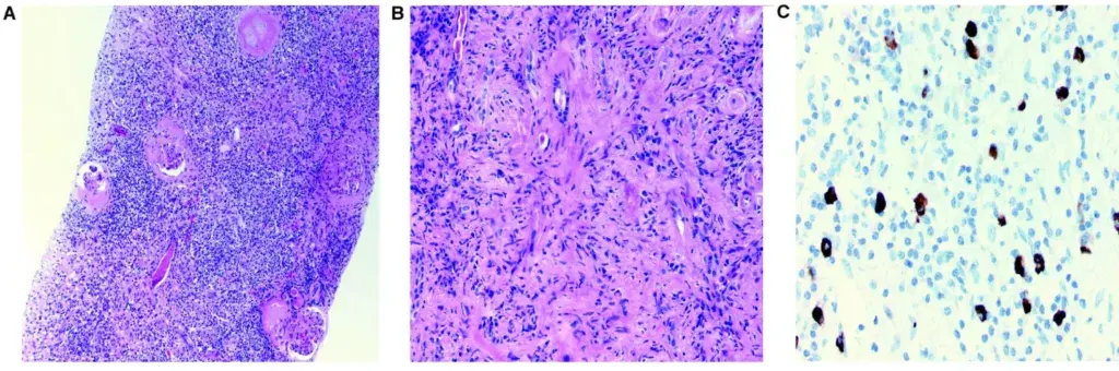 Figura: Principais achados da biópsia renal para nefrite tubulointersticial relacionada a IgG-4. (A) Infiltrado denso de plasmócitos e linfócitos à microscopia de luz (coloração HE). (B) Fibrose estoriforme com aspecto de “cartwheel” é observada na microscopia de luz (coloração HE). (C) Células positivas para IgG4 são observadas em mais de 10 células por campo (imunohistoquímica para IgG4).