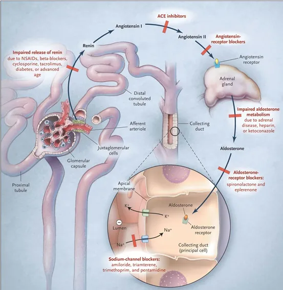1. Palmer, B. F. (2004). Managing Hyperkalemia Caused by Inhibitors of the Renin–Angiotensin–Aldosterone System. The New England Journal of Medicine, 351(6), 585-592. DOI: 10.1056/NEJMra040135 ([link](https://www.nejm.org/doi/full/10.1056/NEJMra035279))