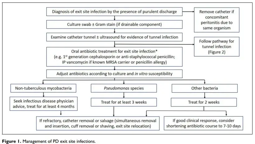 A meta do tratamento é reconhecer e tratar a infecções relacionadas ao cateter de DP e vigilância ativa com complicações.