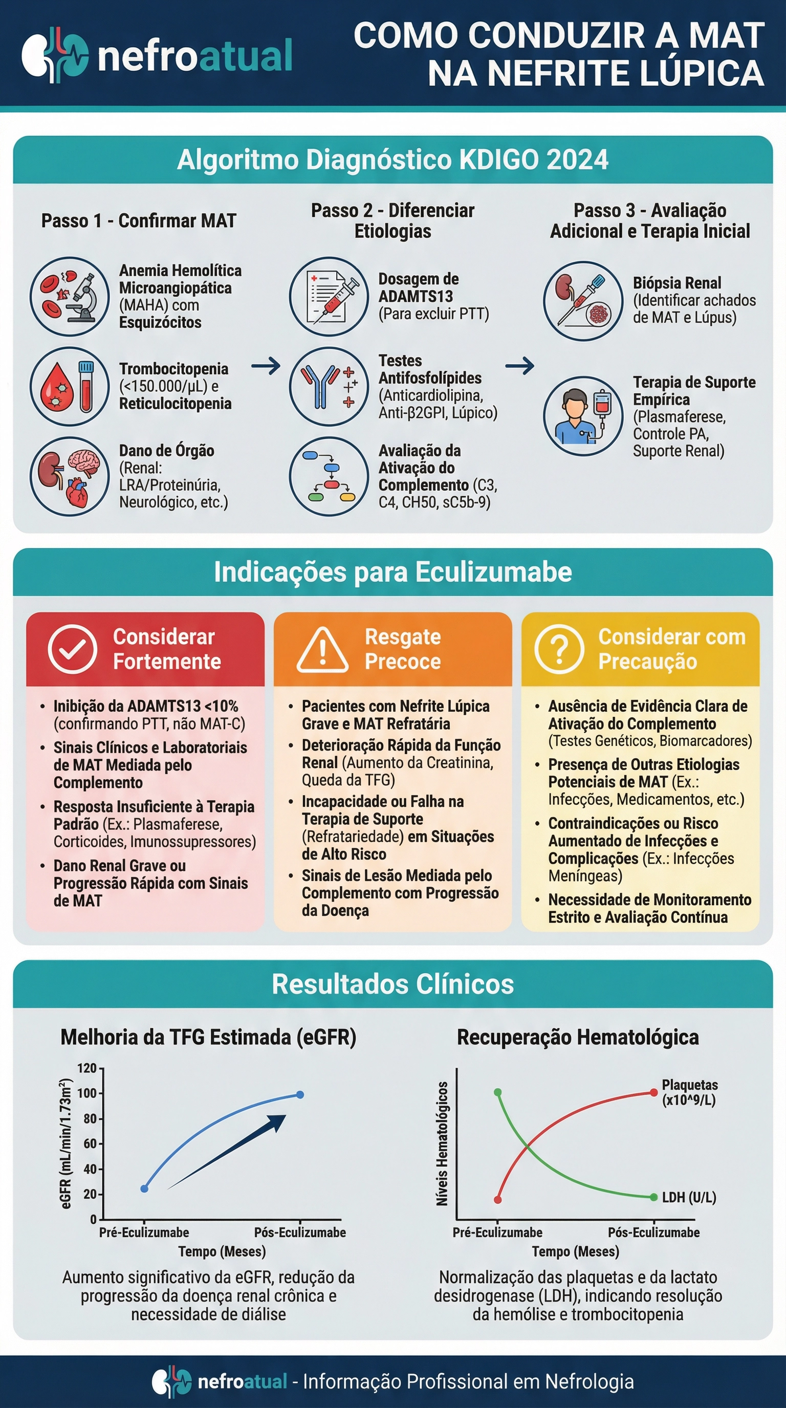 Microangiopatia trombótica (MAT) associada a Nefrite Lúpica (NL) é uma complicação rara, mas com alto risco de perda renal rápida e mortalidade, exigindo decisão terapêutica precoce e etiologia-direcionada.