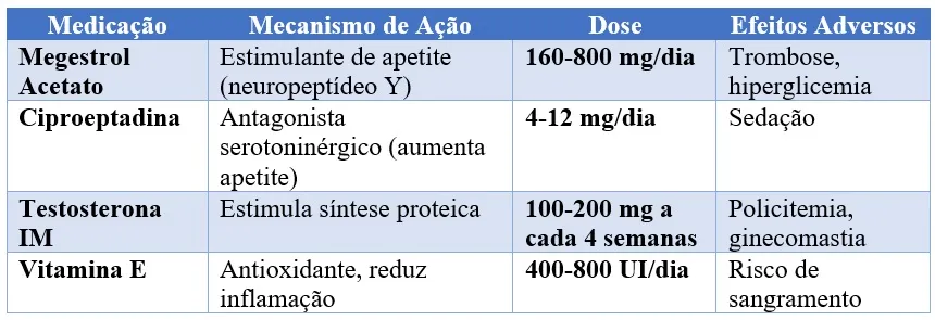 * Estimulantes do apetite: Megestrol e ciproeptadina têm mostrado benefícios.