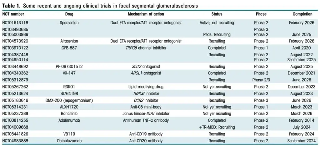 No entanto, recentemente houve um aumento notável em terapias emergentes visando cascatas de sinalização patogênicas definidas. Um resumo de ensaios clínicos recentes e em andamento para GESF são fornecidos na Tabela 1 assim como a data até o final do estudo.