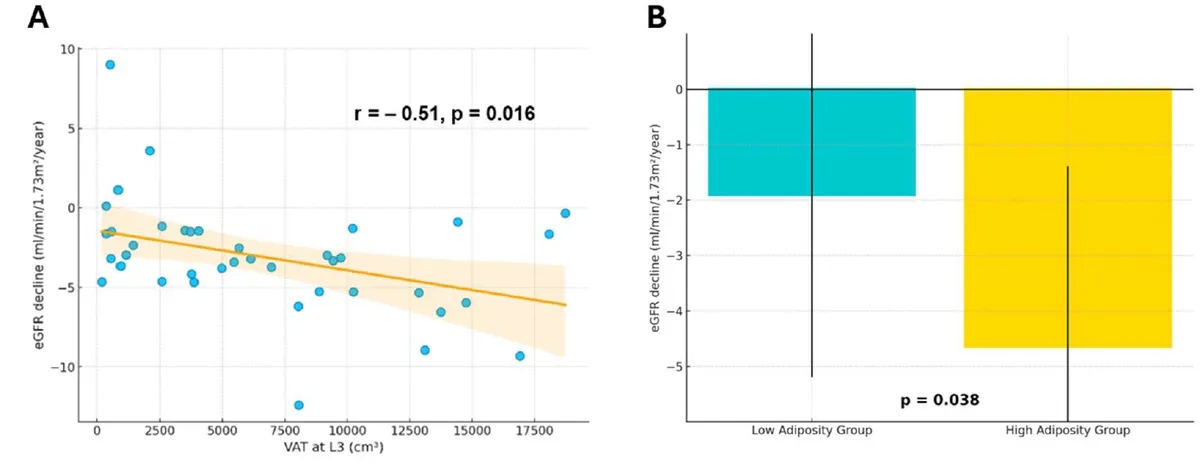Esse estudo foi uma Coorte com 39 pacientes DRPAD, TFGe basal~70 ml/min/1,73m², seguimento médio 31 meses. O VAT foi medido por RM (segmentação automatizada).
