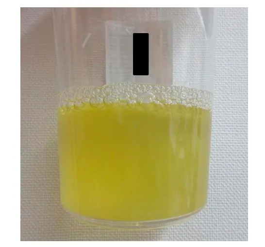 Drenagem de líquido ascítico. Líquido amarelo denso.
