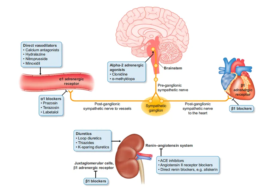 **Figura 1. **Principais locais de ação farmacológica dos medicamentos anti-hipertensivos. Esses locais incluem os receptores adrenérgicos (α1 e β1), os gânglios simpáticos e os nervos que se conectam ao coração e aos vasos sanguíneos. Estão representados fármacos como os betabloqueadores, os bloqueadores α1 (por exemplo, prazosina, terazosina e labetalol), os diuréticos e os vasodilatadores diretos (por exemplo, bloqueadores dos canais de cálcio e hidralazina). A figura também destaca o papel do tronco encefálico, dos agonistas α2-adrenérgicos (por exemplo, clonidina) e do sistema renina–angiotensina, incluindo os IECA e os BRA. As células justaglomerulares e sua interação com os receptores β1-adrenérgicos são ilustradas para demonstrar o efeito redutor de renina dessas medicações.