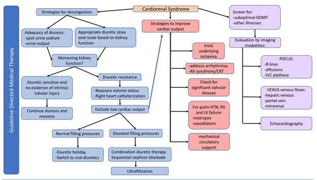 Diante da piora da função renal no contexto da insuficiência cardíaca, é essencial investigar fatores de risco, como ingestão dietética inadequada, subutilização da terapia médica otimizada (GDMT) e outras condições intercorrentes que possam funcionar como gatilhos para uma exacerbação aguda. A avaliação do estado volêmico deve ser feita clinicamente e com o auxílio de métodos de imagem complementares, como ultrassom à beira-leito (POCUS), escore de congestão venosa (VEXUS) e ecocardiografia. Se for constatada sobrecarga de volume, deve-se iniciar um teste terapêutico com diuréticos, ajustando a dose de acordo com a função renal basal e as doses prévias de diuréticos em uso domiciliar. A eficácia da diurese e a presença de resistência diurética podem ser identificadas precocemente por meio da estratégia de medir o sódio urinário em amostra isolada (spot) duas horas após a administração do diurético. Um sódio urinário <50–70 mEq/L nesse intervalo, ou uma diurese horária <100–150 mL nas primeiras 6 horas, indica resposta diurética inadequada. Se a resposta for adequada, deve-se seguir com monitoramento contínuo e reavaliações seriadas. Se houver resistência diurética, deve-se repetir a avaliação do status volêmico. Na presença de dúvidas sobre o volume ou suspeita de baixo débito cardíaco, a cateterização do coração direito deve ser considerada para guiar o manejo. Casos de congestão persistente podem demandar estratégias adicionais, como o bloqueio sequencial do néfron ou mesmo ultrafiltração, se necessário. A presença de baixo débito cardíaco deve ser abordada tratando causas subjacentes como isquemia ativa, com o uso de inotrópicos e vasodilatadores conforme o perfil hemodinâmico, além de suporte circulatório mecânico, se indicado.