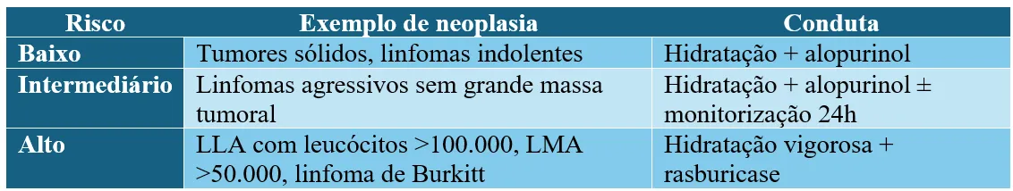 Referência: Bociek RG, Lunning M. Tumor Lysis Syndrome. N Engl J Med. 2025 [**[link](https://www.nejm.org/doi/10.1056/NEJMra2300923?url_ver=Z39.88-2003&rfr_id=ori:rid:crossref.org&rfr_dat=cr_pub%20%200pubmed)**]