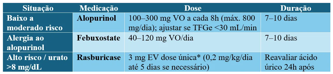 • Rasburicase adicional conforme níveis (1,5–7,5 mg EV).