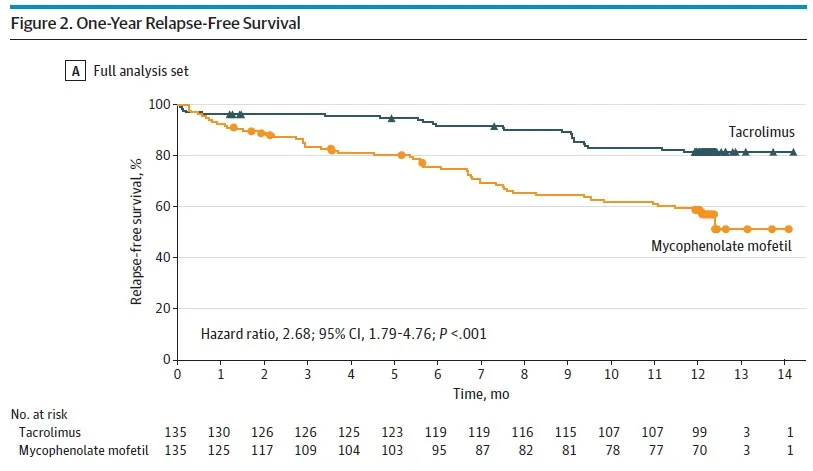 Tacrolimo mostrou superioridade clara em manter remissão por 12 meses, com menor necessidade de esteroides e menor risco de recaída. A segurança entre os grupos foi semelhante, o que reforça a aplicabilidade do TAC mesmo em uso prolongado.