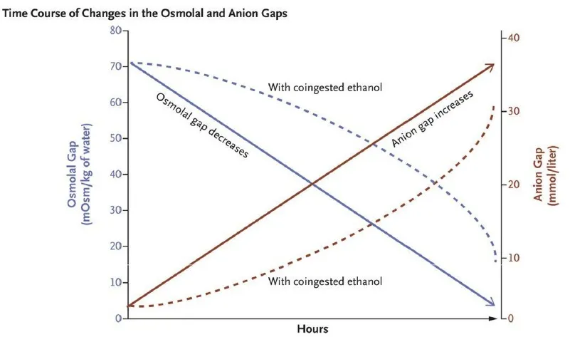 * O gap osmolar cai à medida que o metanol é metabolizado em formato, enquanto AG sobe e acidose pode piorar (ver figura 1).