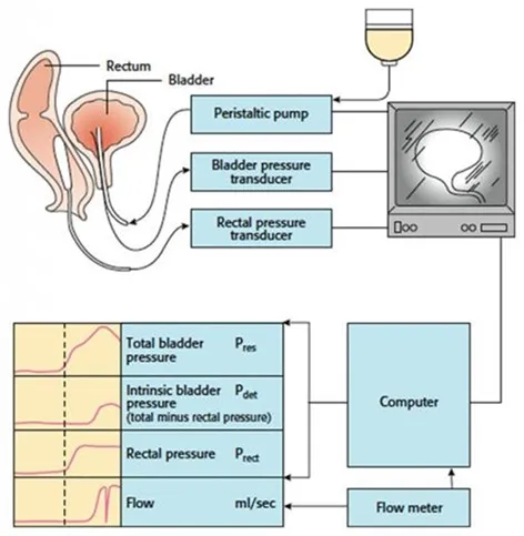 O exame é realizado com a introdução de uma sonda vesical e uma sonda retal para medir simultaneamente a pressão da bexiga e a pressão abdominal. A bexiga é preenchida gradualmente com soro fisiológico e sensores captam a resposta do detrusor durante o enchimento e esvaziamento. Durante a fase de fluxo, o paciente é orientado a urinar normalmente, permitindo a análise da capacidade de contração do detrusor e do fluxo urinário. O estudo pressão-fluxo avalia se há obstrução infravesical ou fraqueza do detrusor.