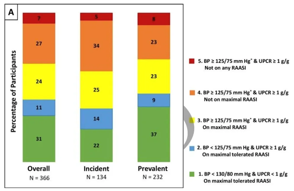 Apensar de os IECAs ou BRAs estavam sendo utilizados em 71% dos pacientes, apenas apenas 41% estivam utilizando a dose tolerada. Apenas 42% dos pacientes estavam otimizados para a pressão arterial (Figura abaixo).