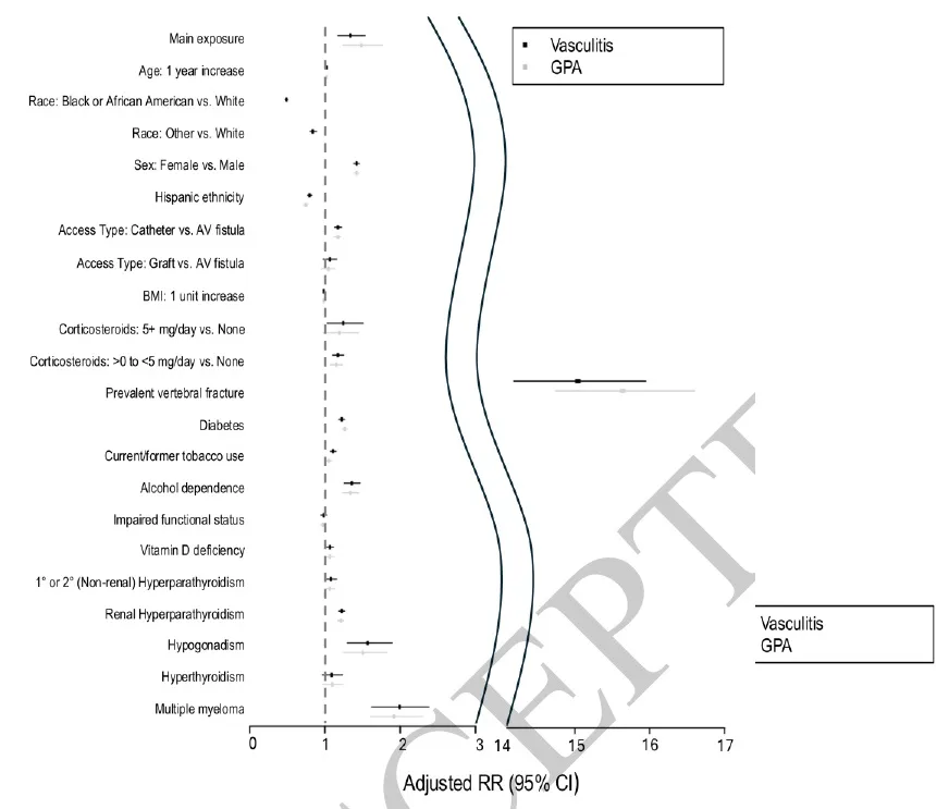 Além disso, fatores como cateter venoso central em vez de fístula arteriovenosa e histórico de fraturas vertebrais prévias foram associados a uma maior probabilidade de fraturas incidentes. A inflamação crônica inerente às vasculites foi apontada como um fator adicional de perda de densidade óssea e aumento da fragilidade esquelética.